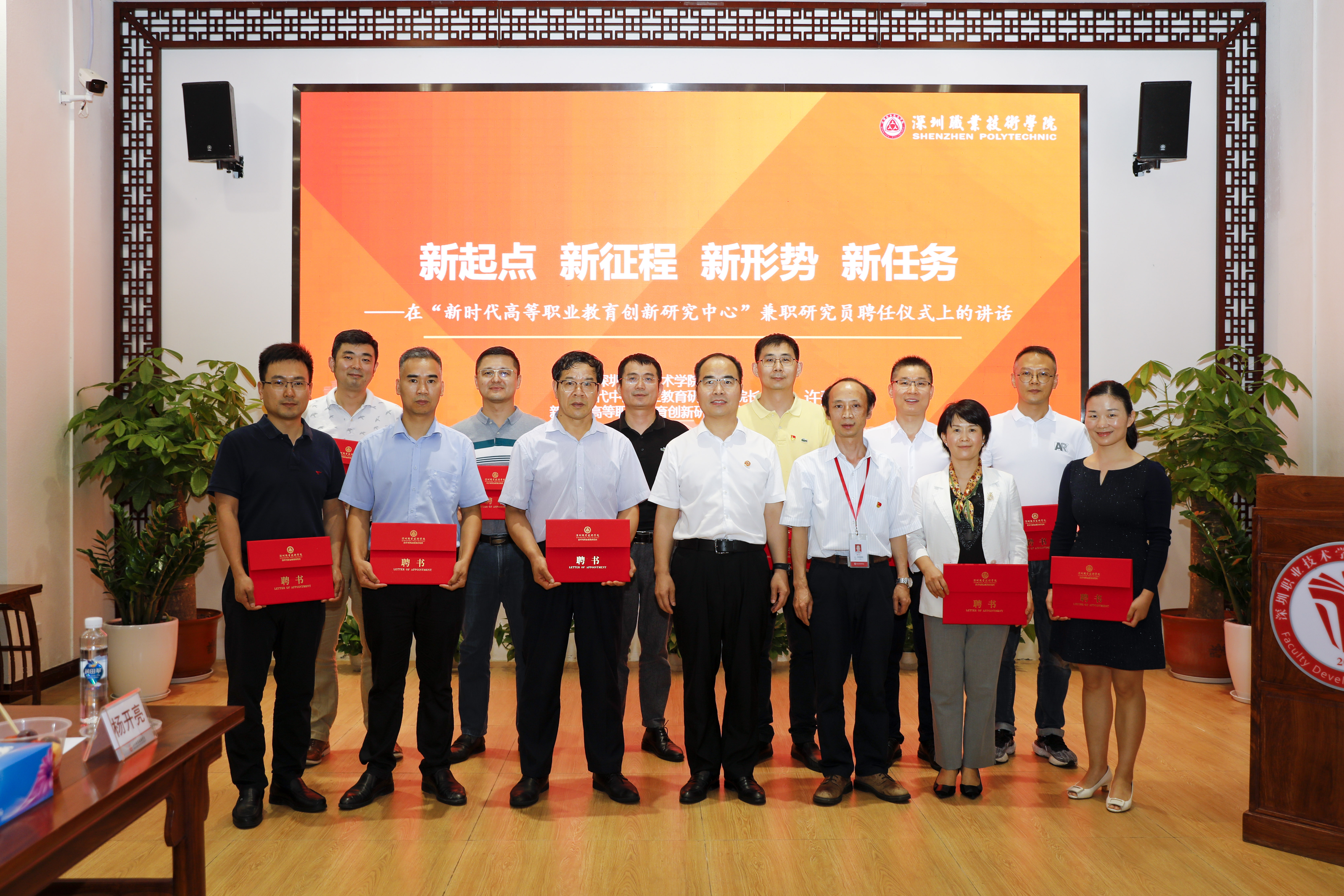 许建领为兼职研究员颁发聘书、合影留念,并以“新起点、新征程、新形势、新任务”为主题致辞。他说,学校高度重视职业教育研究高地建设,今年2月,新时代中国职业教育研究院申报的“新时代高等职业教育创新研究中心”被广东省社科联批准为广东省社会科学研究基地,为我校职业教育研究提供了新的发展机遇,为了进一步凝聚研究力量,我们聘请校内13名研究人员作为第一批兼职研究员,希望大家发挥各自优势,凝心聚力,不断提升学校职业教育研究的水平和影响力。许建领指出,中心的五年发展目标是建成国内领先的职业教育研究高地,形成有广东特色和中国特色的理论体系与方法论体系;参与国家职业教育规则制定,发挥智囊作用,不断增强在全国的影响力;培养若干在国内知名的职业教育研究专家,建成职业教育战线认可的期刊平台和科研基地,在职业教育领域享有重要的学术声誉。力争成为高等职业教育基本理论研究的理论策源地,在高等职业教育实践创新研究方面形成“深职范式”,在高等职业教育国际比较研究方面探索中国特色。他鼓励各位研究员积极参与新时代中国职业教育研究院组织的研究课题,发表高水平研究论文,撰写高水平研究报告和政策建议书,撰写高水平学术专著,为职业教育研究贡献新理论、新理念、新知识、新技术和新方法。希望大家坚守学术追求,让学术生命熠熠生辉,在学术上有更大的作为和影响。