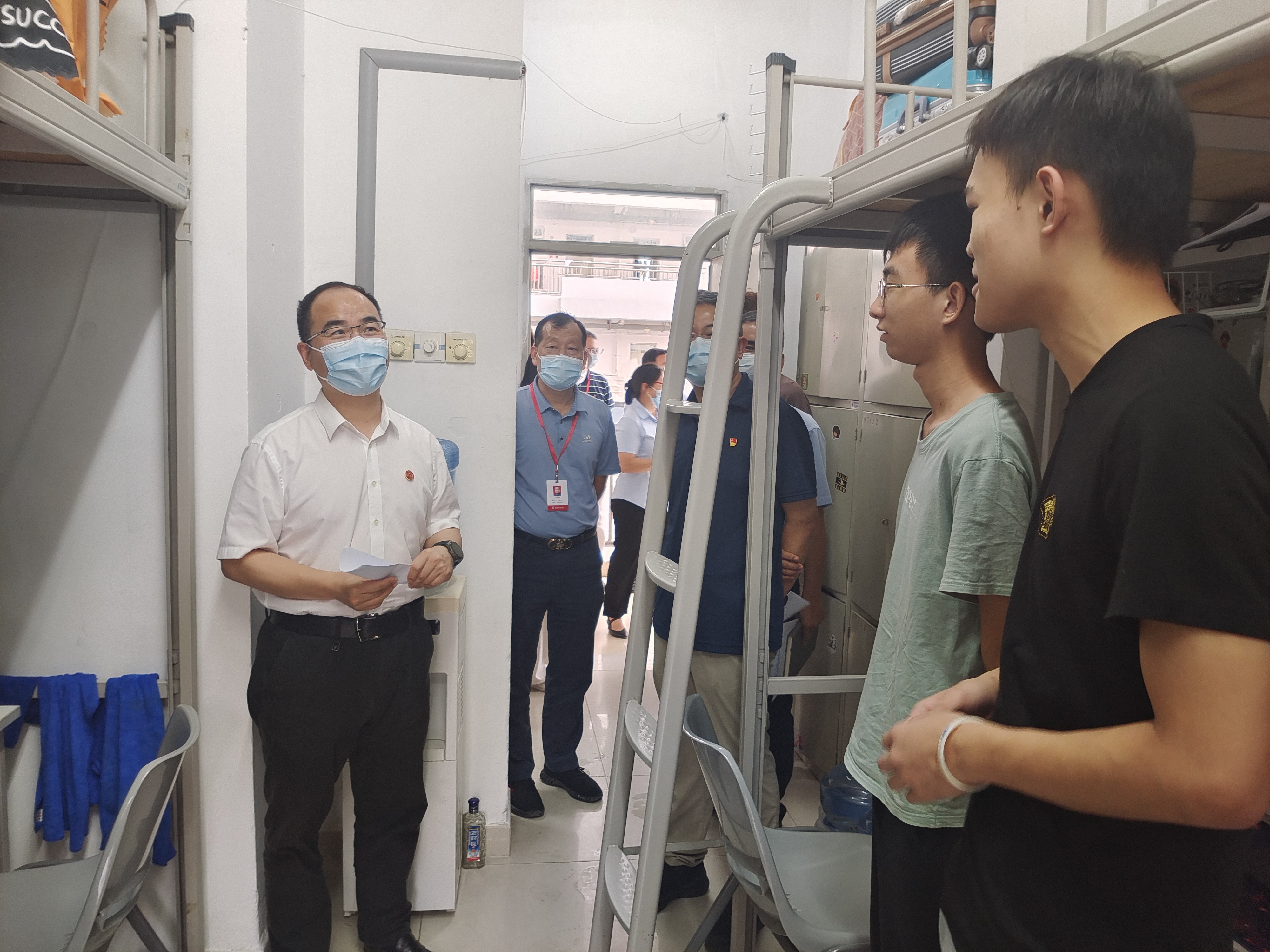 许建领在学生处及医护学院相关负责人陪同下来到官龙山校区瀚园CD栋学生宿舍,与医护学院眼视光技术专业学生交流谈心。许建领询问同学们返校后的感受以及当前存在的困难,了解同学们当前的生活和学习情况,并向同学们致以亲切关怀。在谈到专业前景、专业学习和职业规划等问题时,许建领鼓励同学们开阔眼界,及时了解眼视光技术发展趋势,特别是深圳眼科发展现状,才能更好定位自己的职业发展方向和目标。最后,他勉励同学们要勤奋学习、加强锻炼、练好内功,把握机遇,才能更好地融入深圳经济建设中;感恩党和政府,坚定战疫信心,严格落实学校疫情防控各项规定。
